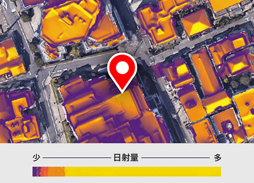 サンクルの最大の特徴は、黄色と紫のカラフルな地図。 日射量が多い順に「黄」→「オレンジ」→「紫」の色で表示します。 あなたのお家がどれくらい太陽光発電に向いているか、 ぜひお試しください。
